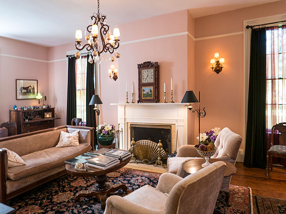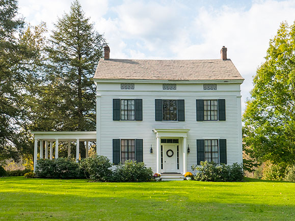Carefully restored c. 1840 classic Greek Revival center hall has handsome entry porch, original door (with transom and sidelights), elegant hallway and stair. …A large front to back parlor has fireplace and windows on three sides and is opposite an elegant living room (with fireplace), which leads to a large columned open side porch and a formal dining room plus a charming dining nook in a bay window. The back wing has an open kitchen with timeless cabinets and soapstone counters, and a full bath. Upstairs are four spacious bedrooms, an office, and two baths. Beautiful wide floor boards, original doors and hardware are throughout and tall windows provide wonderful light. Full basement, attic, and three-car garage allow for ample storage. The property includes four parklike landscaped acres with tall mature trees. This is a magnificent house for entertaining, nestled in a cluster of some of upstate New York's most historic houses including the 1785 Georgian Ludlow house across the street.