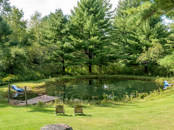 Nestled in a three-acre park-like setting, on a quiet lane, overlooking its own swimming pond with dock, the front door of this contemporary cape opens to cook's kitchen on one side and spectacular dining and living areas with vaulted ceiling on the other. … Architect designed kitchen features a rugged six-burner Wolf stove, with stainless hood, centered on the chopping-block island across from the smooth concrete counter with smart faucet and sink. Custom built butternut wood cabinets and stainless appliances complete the kitchen. The light-filled living area has an impressive tall stone fireplace and glass doors that lead to a large deck viewing the pond. The first floor includes two guest bedrooms and a beautifully renovated bathroom. Discreet stairs lead to an interior balcony that overlooks the living area and to a huge private master bedroom suite, with a stunning bathroom. A full dry basement is set-up for storage, laundry, and play. Located near Old Austerlitz, a living history museum, and the 2000+ acre Harvey Mountain State Forest, a managed wildlife habitat with extensive trails, and the highest elevation in Columbia County.