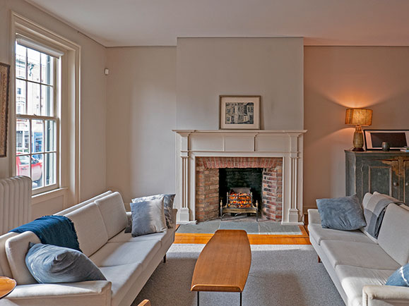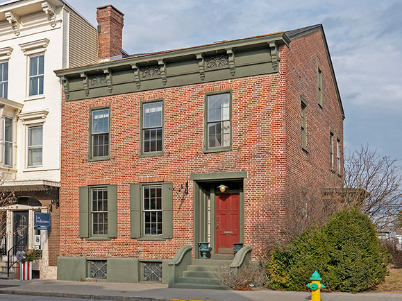 In the heart of Hudson's Warren Street, this elegant side-hall brick townhouse has spacious bright rooms offering great versatility as a live-in and work space. Ideal for gallery, shop, restaurant or professional offices plus studio apartment on the ground floor with charming full-floor apartment above, or the whole building can be a beautiful residence. … Built in 1795, it has many elegant original details, including two fireplaces with beautiful Federal mantels, doors, and trim. About 1840 the house was updated with Greek Revival details including the front doorway surround and graceful staircase, at which time the roof was raised to allow for a walk-up third-floor space (now used as storage) and eyebrow windows with classic Greek Revival grills. Later, Victorian brackets were added to the facade and the house was used as the parsonage for the prosperous church next door. Lovely enclosed, private garden and off-street parking complete this multipurpose property.