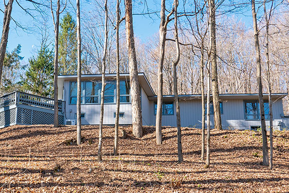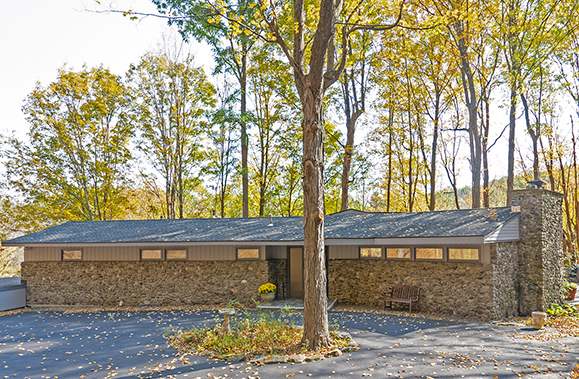 The juncture of two angled stone-clad wings gives the appearance of welcoming arms to the entrance door which opens to the living room with vaulted ceiling and fireplace, spacious kitchen and dining area, opening to a huge deck and lovely foothill vistas. …Short windows, grouped into ribbons high on the facade provide interior privacy yet abundant light. A handsome broad low stone chimney matches the stone on the facade. On the other side of the house there is board and batten siding with large windows and glass doors overlooking the valley view. Two bedrooms and bathrooms complete the main level; the lower level contains a third bedroom and bathroom, various other work and play rooms and attached large two-car garage. The beautiful 25-acre property, consisting of three separate lots, is on a secluded tree-lined country road with 3/4-acre swim pond. It's a long walk or short bike ride to the center of Old Chatham, and an easy drive to the Berkshires, the Capital District, Chatham Village, or Hudson.